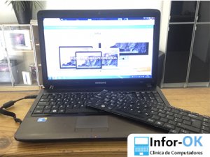 Este Samsung NP R540 deu entrada nas nossas instalações pois levou com água em cima do teclado e este deixou de funcionar. Na Infor-OK procedemos então à substituição do teclado por um novo e de seguida fizemos uma limpeza interna e aplicámos nova pasta térmica. Ganhou nova vida.
